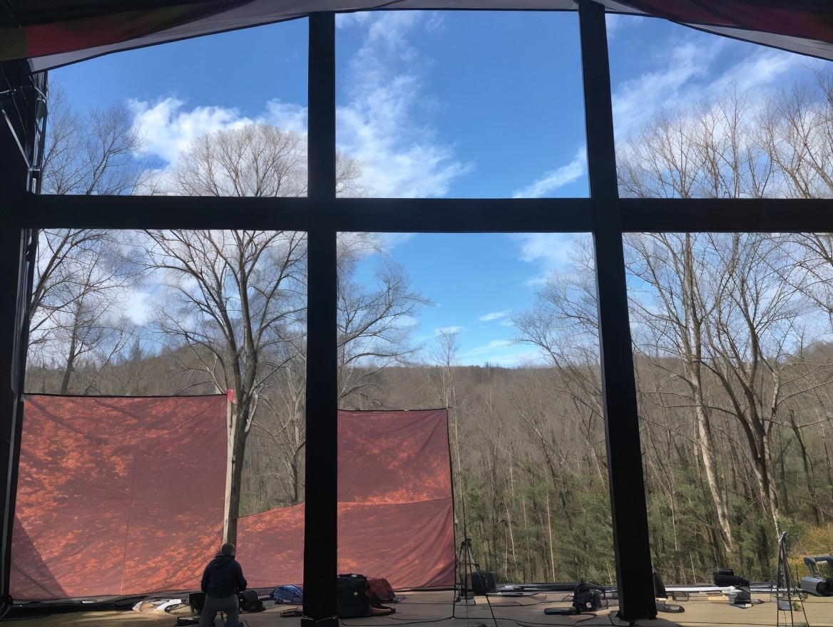 A panoramic interior view of a natural landscape mural with autumn trees and mountains, visible through large floor-to-ceiling windows. Based on a picture of an old gigantic window screen before it was removed