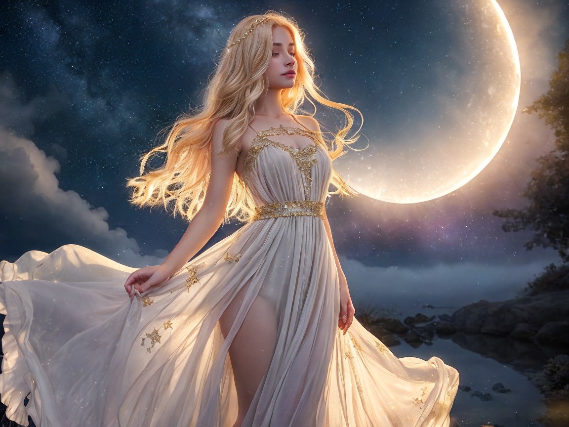 Golden coins cascading from starry sky, ethereal blonde woman, 18 years old, chiffon dress, transparent fabric, wide neckline, moonlit silhouette, shimmering, catching coins, night scene, dreamy atmosphere, elegant pose, long flowing hair, radiant glow, magical moment, surreal elements, celestial background, whimsical concept, detailed and intricate, soft pastel colors, glowing lighting, enchanting ambiance.