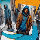 The image features a stylized collage of a young man in urban attire, surrounded by artistic elements and vibrant colors. Each pose showcases his confidence against a city backdrop. Based on AI paintings I did earlier.