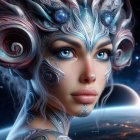 A stunning model with intricate blue and silver makeup, adorned with a celestial crown. The background features a cosmic scene with planets, emphasizing a futuristic, ethereal vibe.