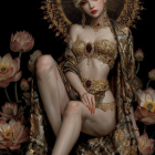 A striking figure poses in metallic attire, surrounded by glowing flowers and rocks. The ethereal background features a radiant halo, enhancing the futuristic and celestial vibe of the scene.