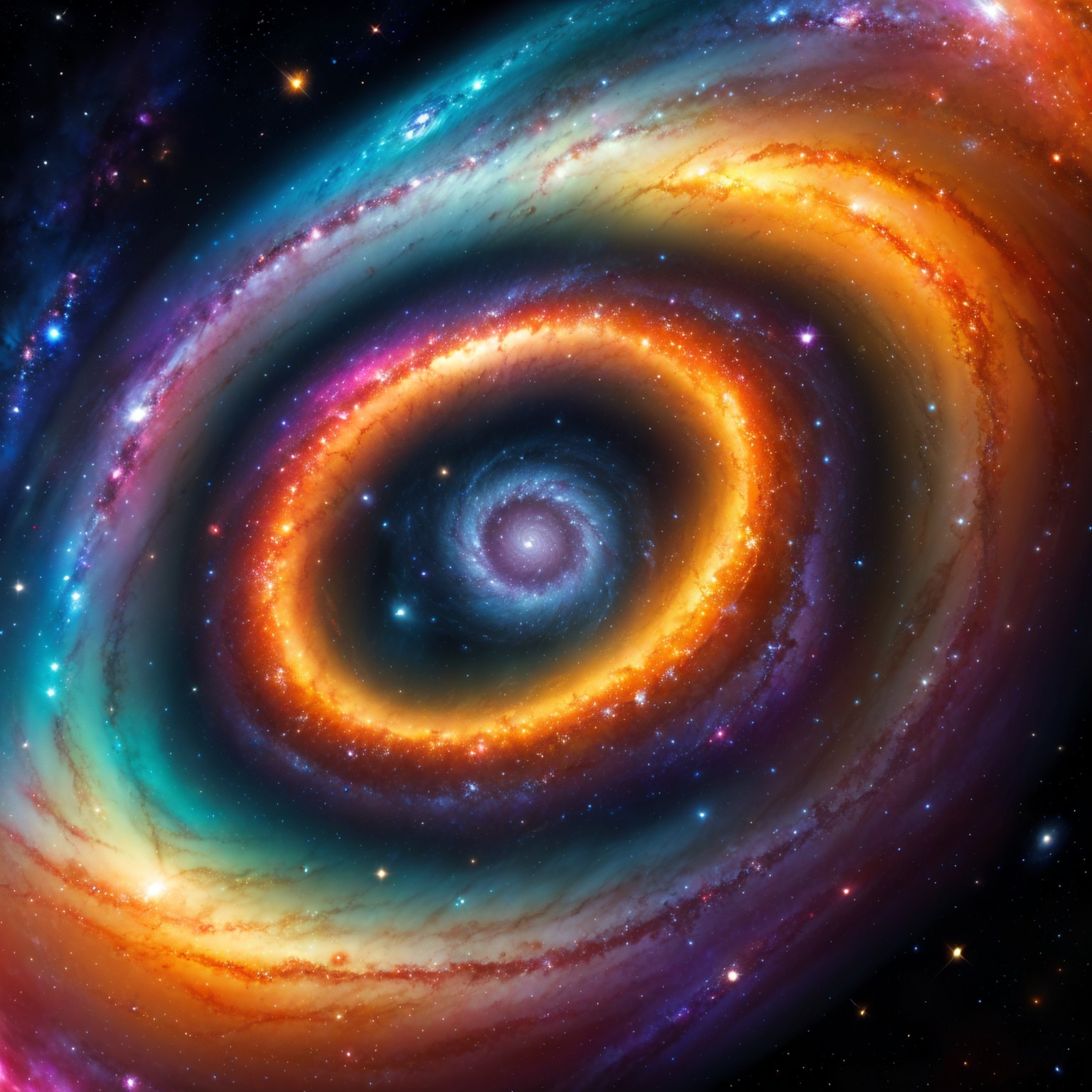 A vibrant, swirling galaxy filled with vivid colors of orange, blue, and purple. Stars twinkle amidst the cosmic backdrop, creating a mesmerizing spiral formation that evokes a sense of wonder.
