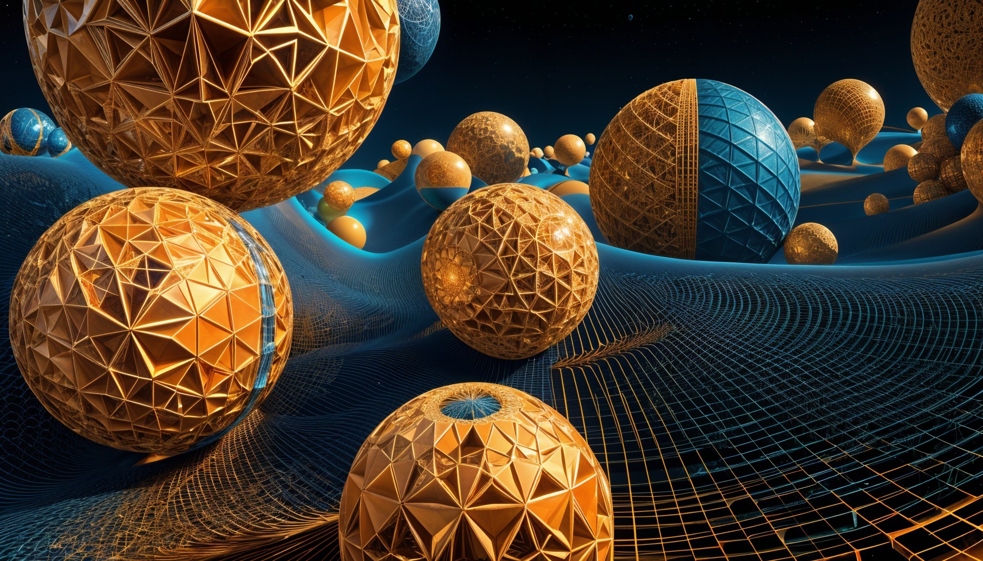 The image features reflective golden spheres scattered across a textured blue surface, set against a dark, starry background, creating a visually striking contrast and a surreal atmosphere.