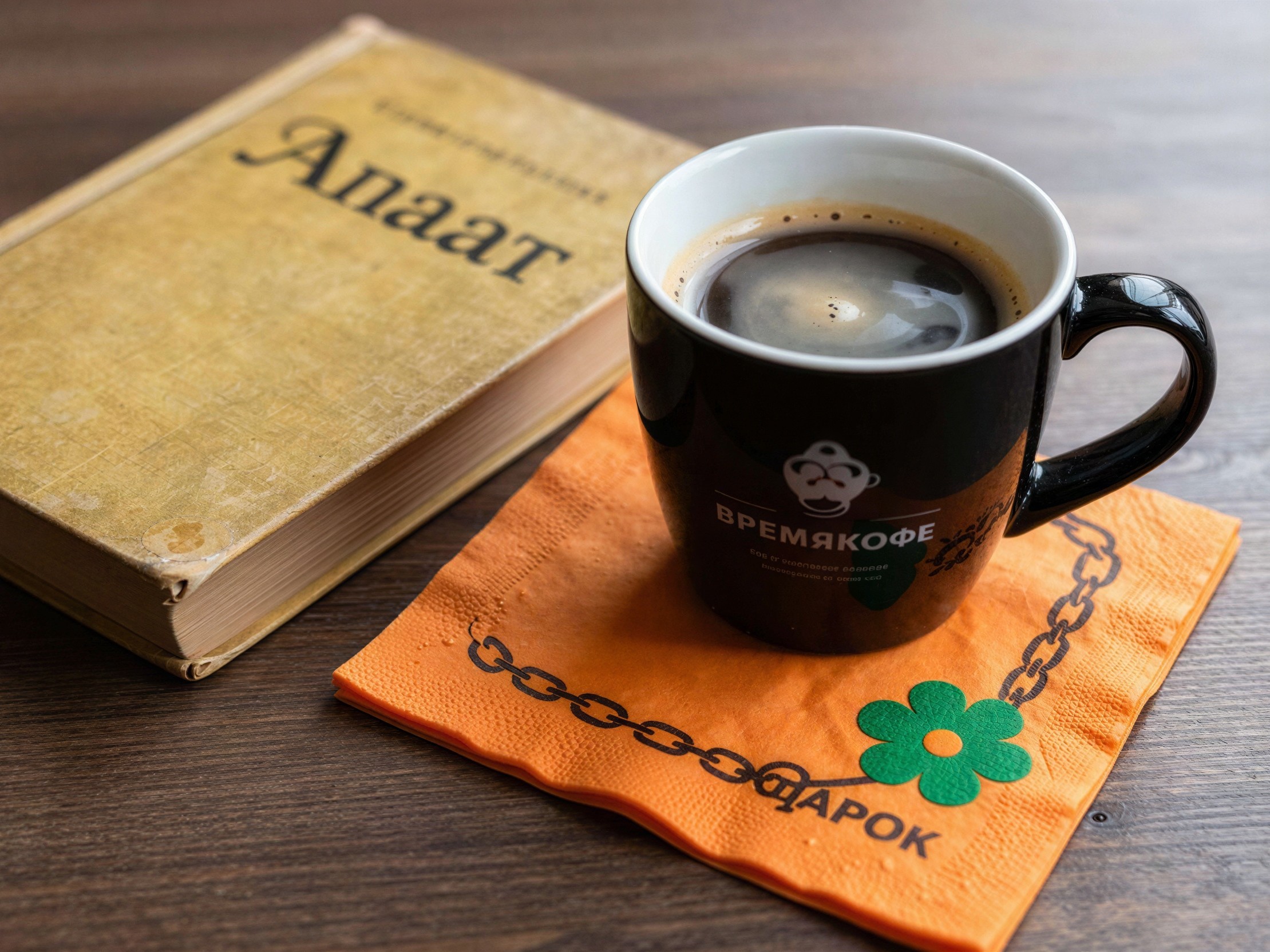 A black coffee mug filled with espresso rests on a folded orange paper napkin, which is decorated with a black chain design and a green flower, next to an old, beige-colored book with a worn cover and the text "АПААТ" (presumably "AПААТ" in Cyrillic