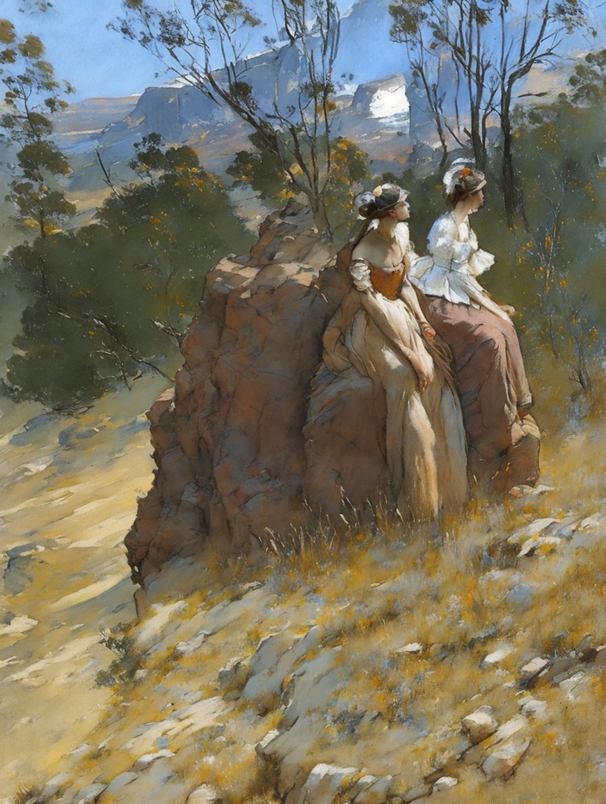 Two people in vintage attire sit atop a large rock, overlooking a misty, impressionistic landscape with subtle hints of a cottage.From my own image.