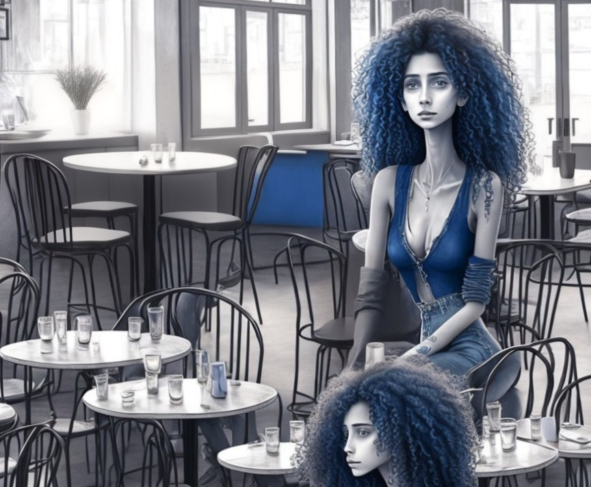 + Prompt:A lonely young woman with perfect body from head to toe, she is completely alone in a empty cafe restaurant. Skinny, curly disheveled with crazy hair counting on happiness,in top and blue jeans. Caricature like a child drawing, skinny, curly disheveled with crazy hair,she is in top and blue jeans, whirlwind if colors, charcoal drawing and sepia with touches of colors in background, burgundy, soot, sketching, grunge, alcohol ink, play of lights and shadows, watercolors. John Poppleton and Bob Ross styles. difussed lighting,double exposure, blend, illusion, octane render, digital painting, extremely detailed,8k pencil drawing, sketch.