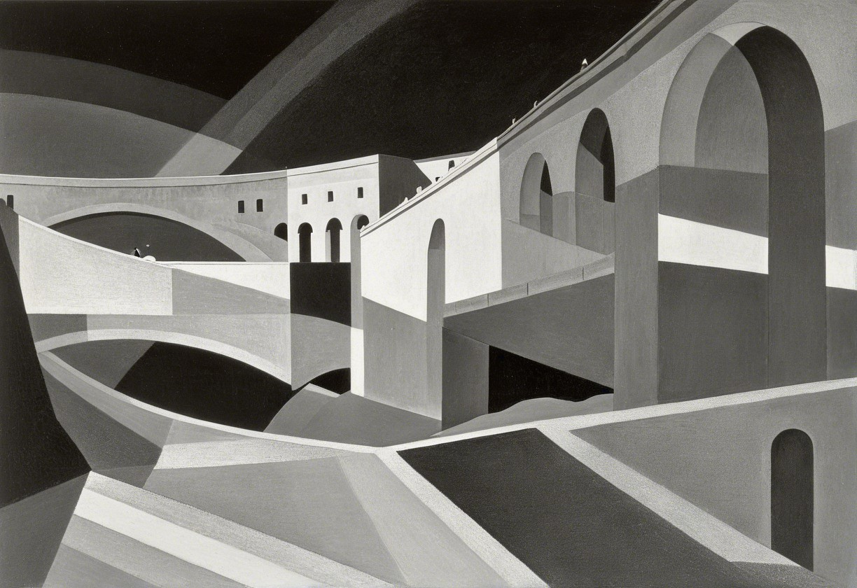Stylized Black-and-White Architectural Scene with Bridges