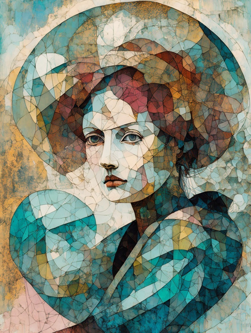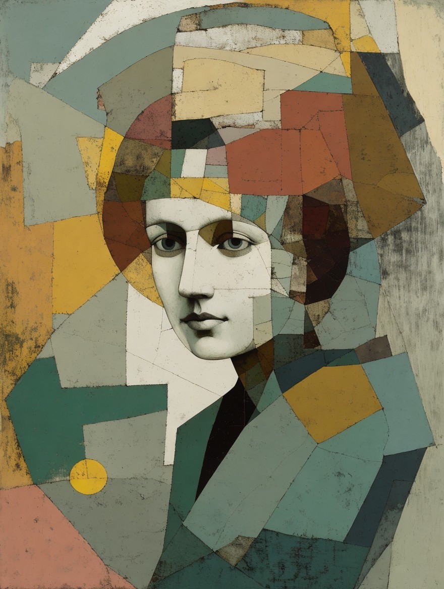 A stylized painting of a human face with geometric patterns in earth tones, evoking cubist and ancient art influences.