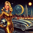 A retro-futuristic scene featuring a stylish woman in a gold jumpsuit, standing beside a sleek, shiny spaceship against a cosmic background with colorful planets and a glowing arc.