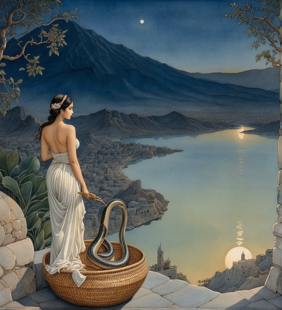 A serene woman in a flowing white gown stands near a basket, holding a golden object. A large snake rests beside her amidst a tranquil landscape of mountains and olive trees under a moonlit sky.
