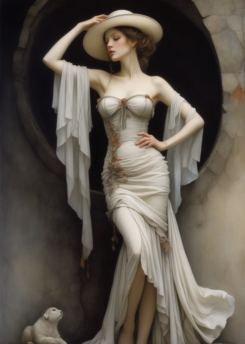 Elegant woman in a white dress and hat posed by an archway with a lamb, exuding a classical, romantic vibe.