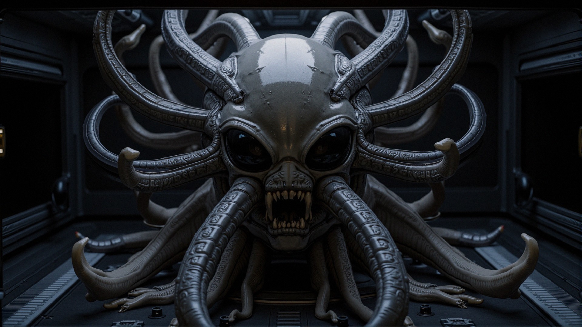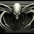 A large, menacing alien creature with multiple tentacles and a sleek, armored head, set against a dark, futuristic background.