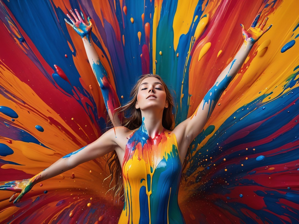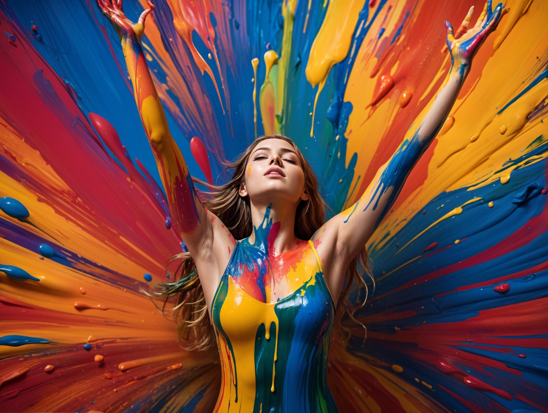 A woman stands against a vibrant, splash-painted background, arms raised, covered in colorful paint. Her expression is one of joy and freedom, embodying creativity and exuberance.