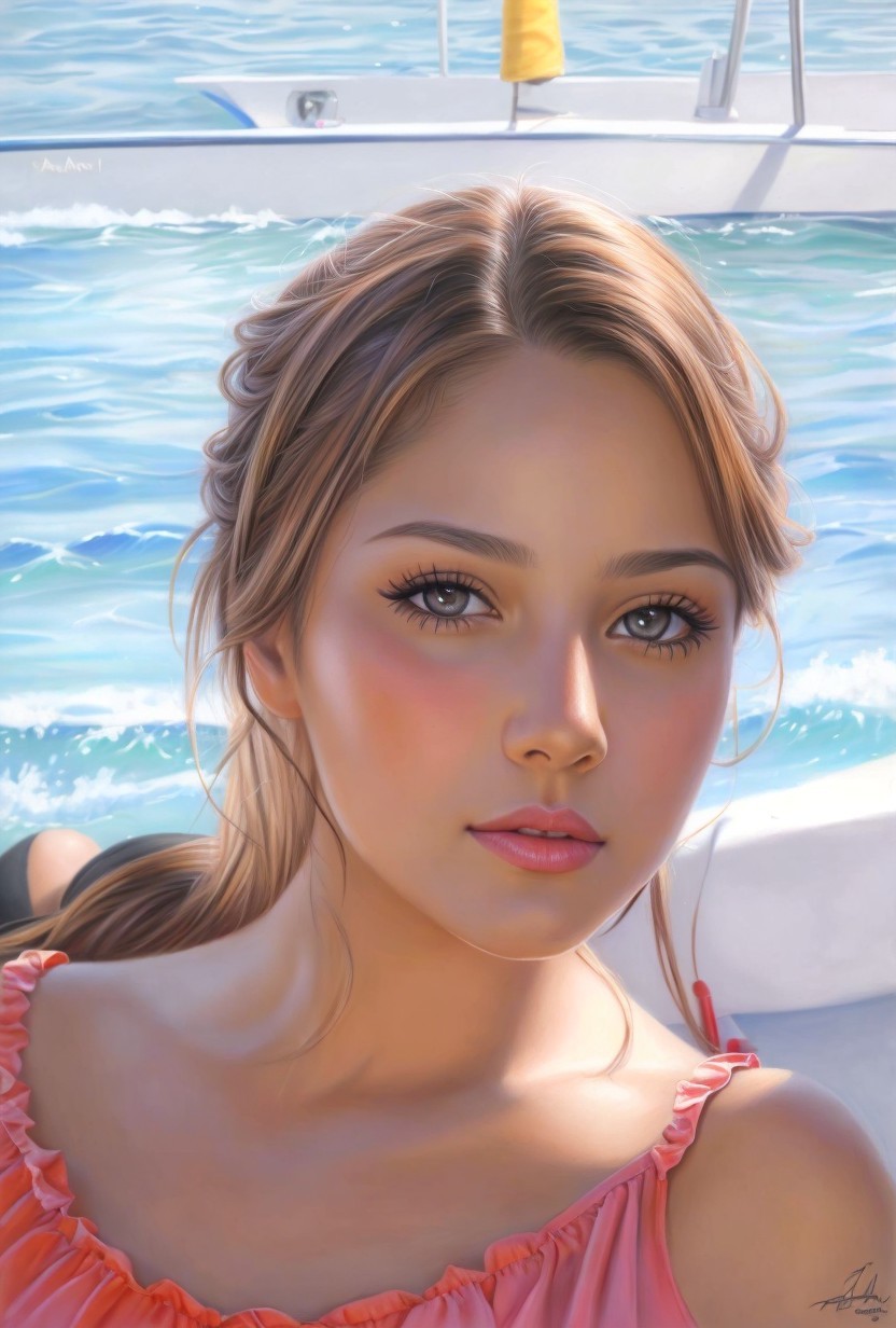 A digital artwork of a young woman with flowing hair and a floral dress, set against a background featuring a boat and a clear blue sea.