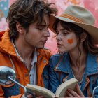 Full shot of an attractive couple sitting on a shiny orange scooter, a man and a woman, who are dressed in trendy leather jackets and blue jeans, looking down and reading a light blue book titled "Motorcycle" open on the handle bars of the scooter, in front of a turquoise blue dilapidated shack