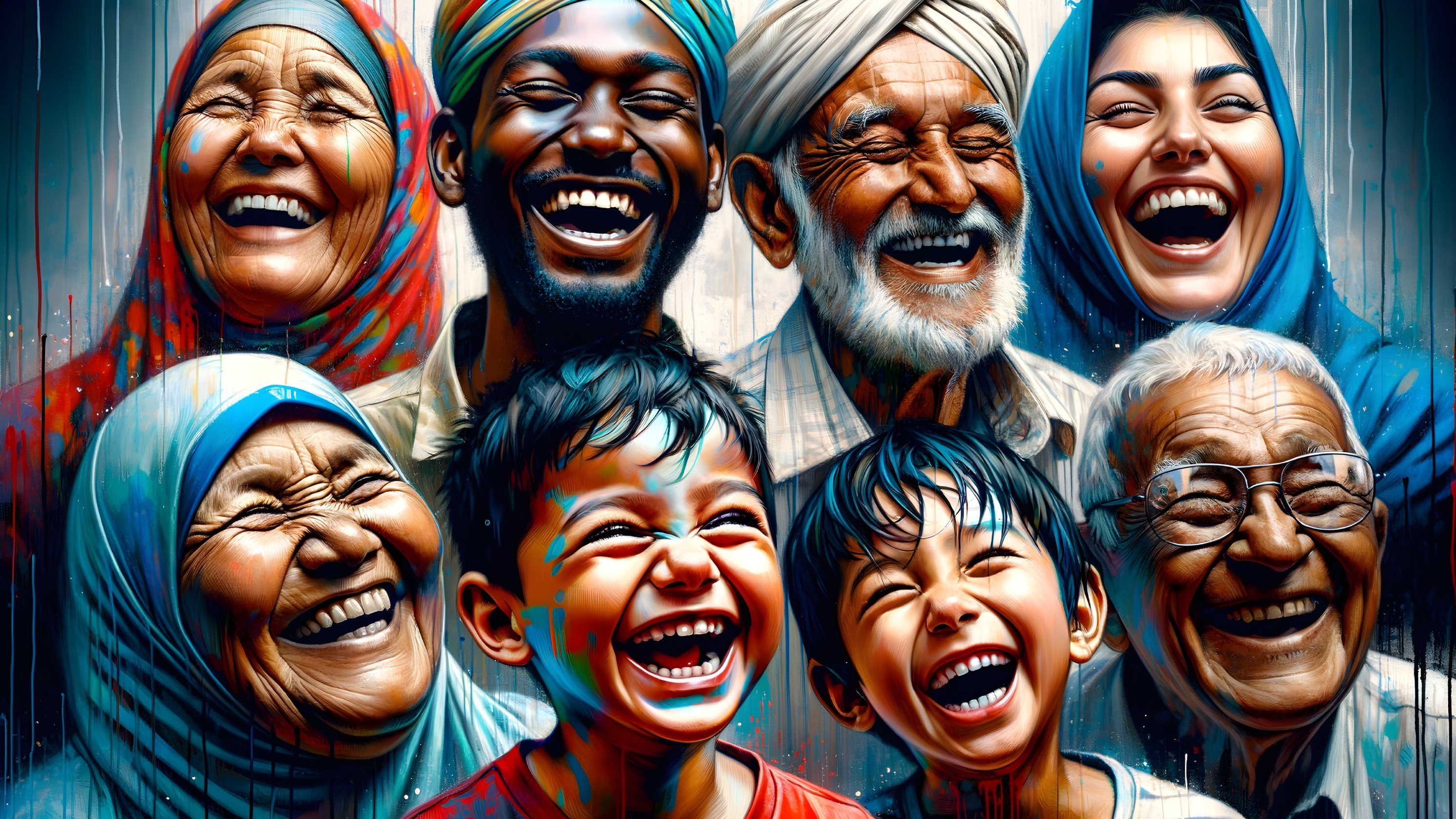 This digital illustration captures the essence of joy through vibrant colors and dynamic composition. It features candid moments of laughter and genuine happiness across diverse faces, enhanced by expressive brushwork and high contrast lighting, creating an uplifting atmosphere filled with emotional connections.
