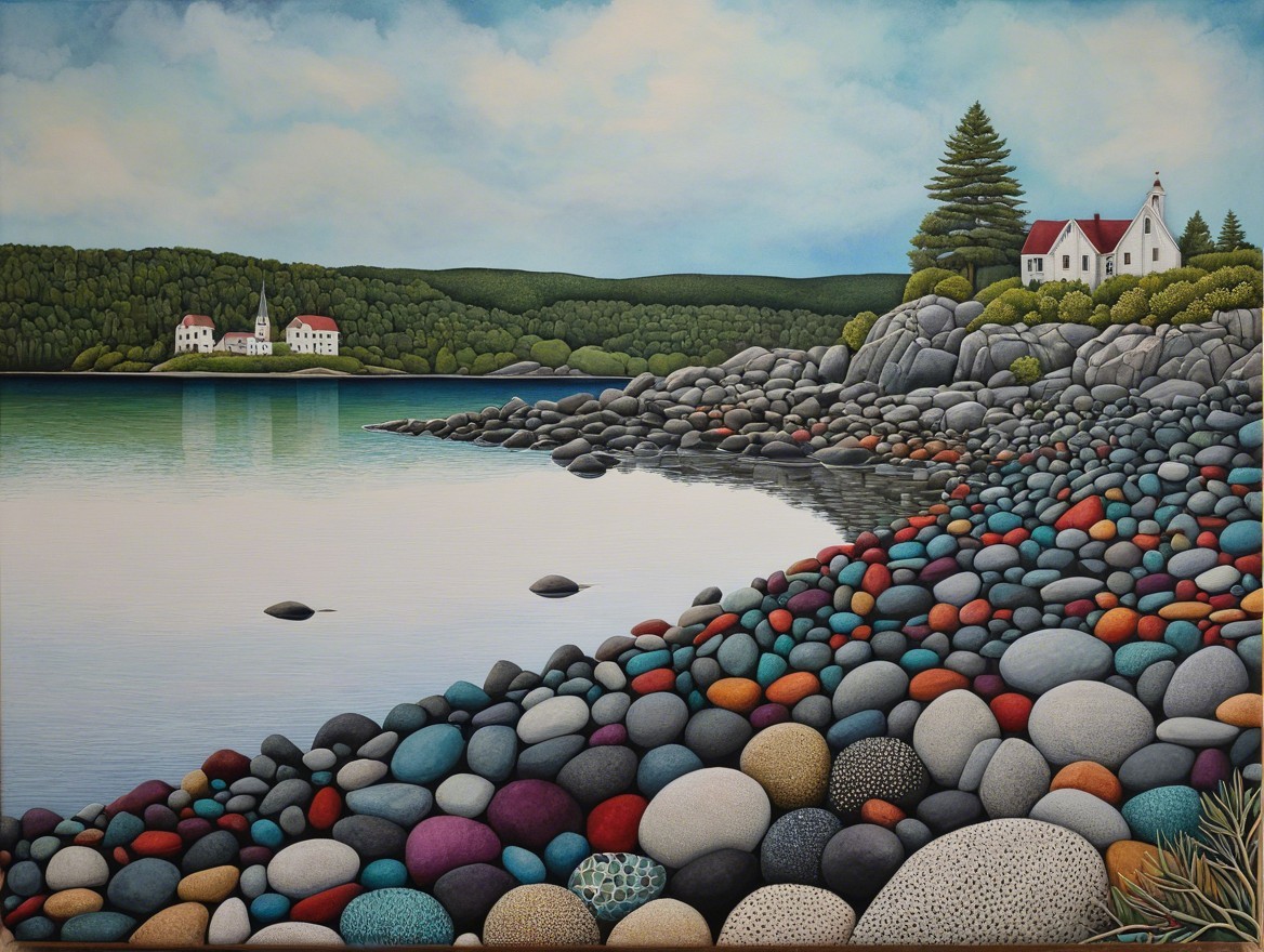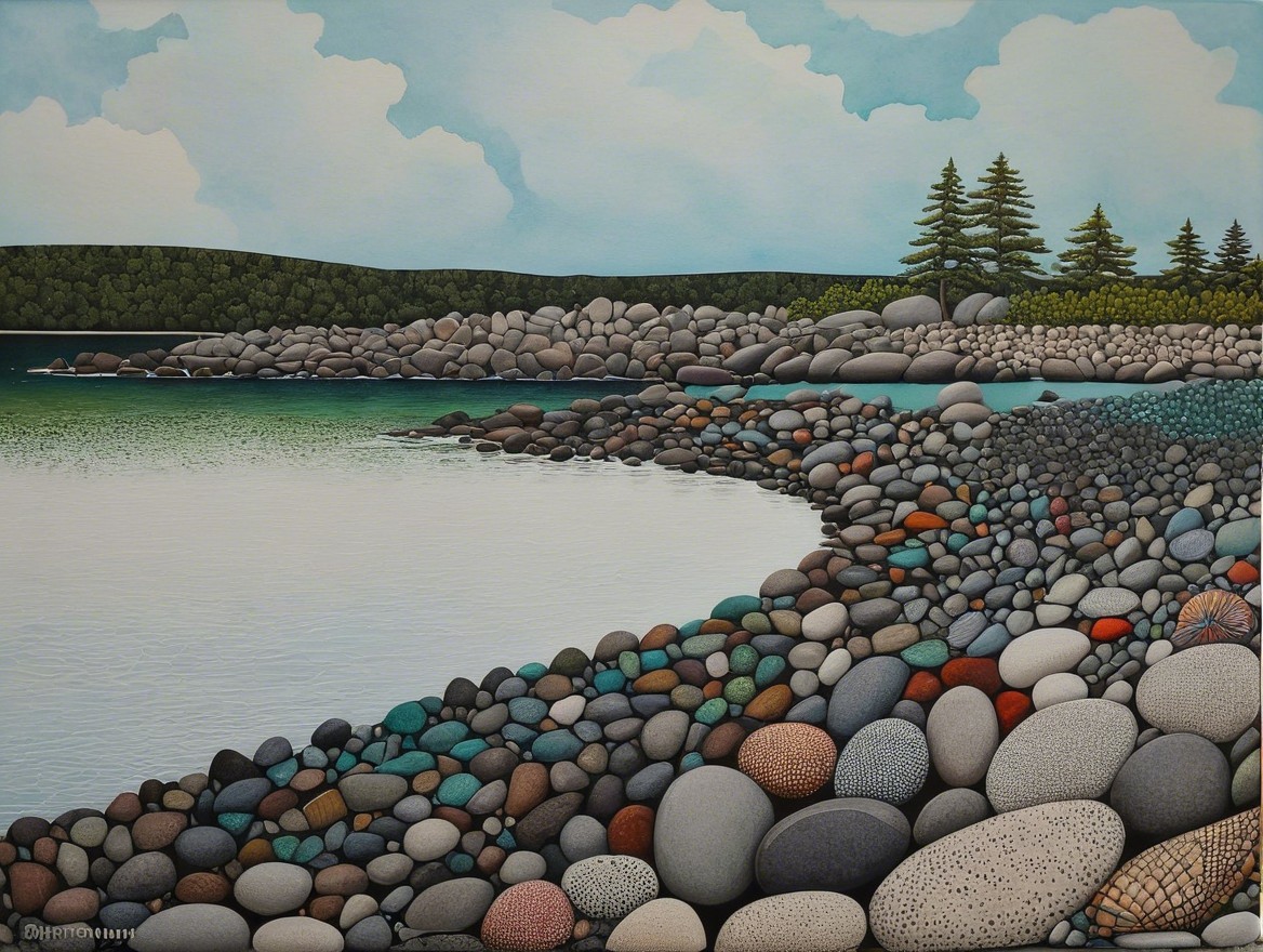 Tranquil Shoreline with Colorful Pebbles and Hillside