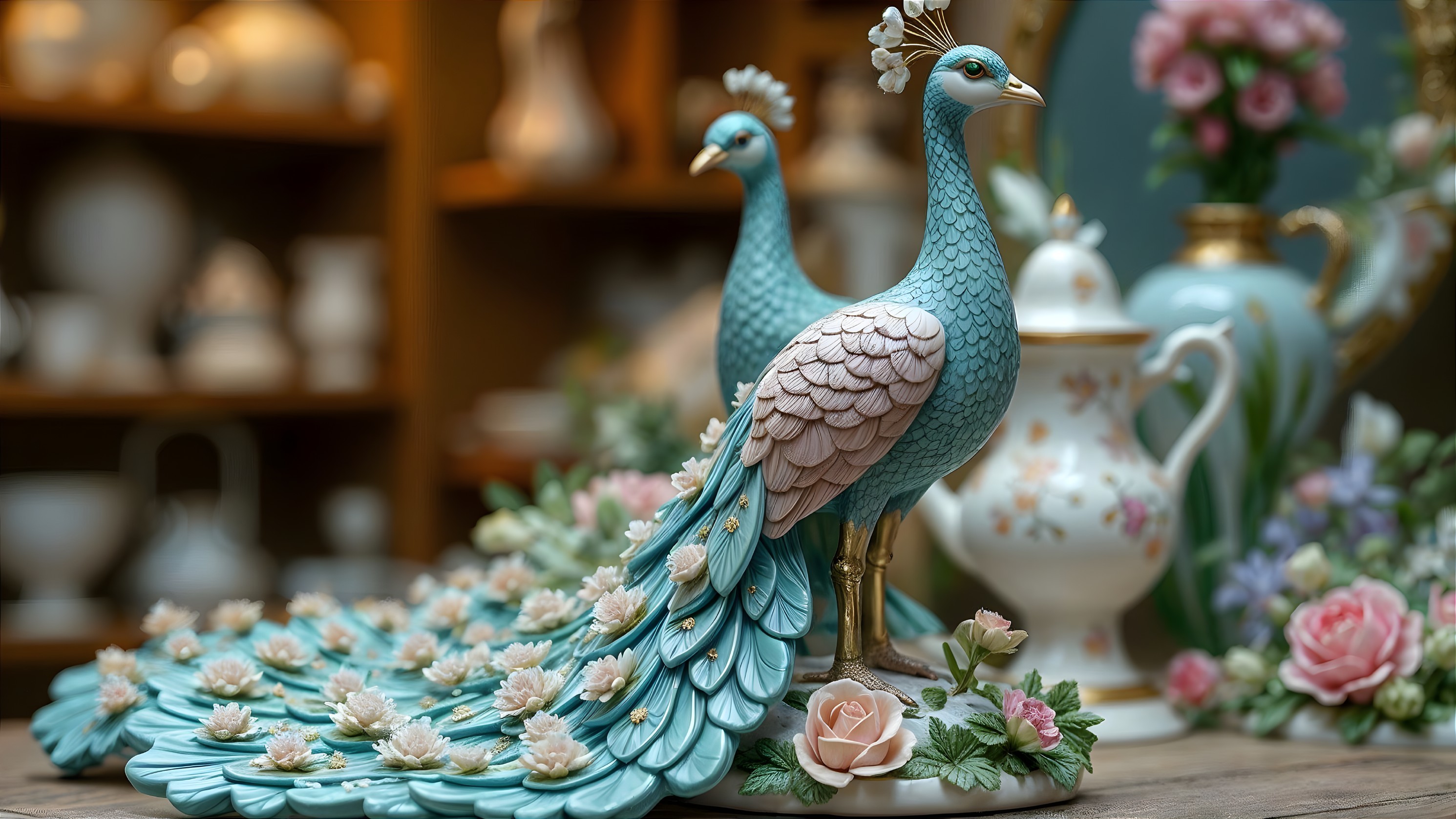 This exquisite porcelain peacock figurine showcases intricate craftsmanship and glossy pastel hues, exuding elegance and charm. Set against a matte backdrop, it features hyperrealistic details and cinematic allure.