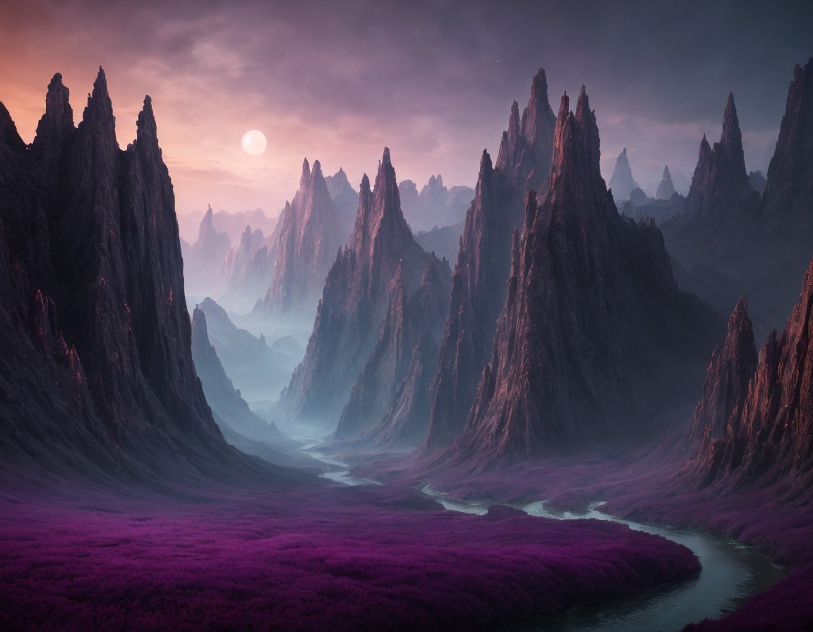 A fantastical landscape with vibrant pink foliage, towering spires, a serene river, and a sunset beneath a sky with multiple moons.