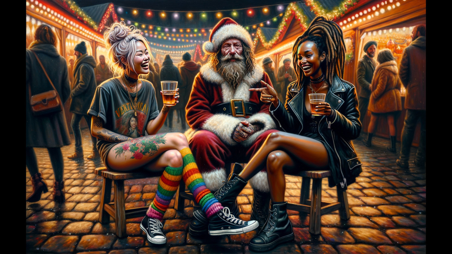 Scratching, splashing, blotting, irregular, squiggly line and paint stains and ink splatter and squiggly textures come together to bring to life in vibrant colours a very beautiful young blonde ethereal urban Vietnamese woman with a blonde messy bun and a very beautiful young ethiopean woman with dark long dreadlocks and floral tatoos. With a smile they sit left and right of an old completely drunken, ragged and jolly Santa Claus impersonator in a mulled-wine stall on a well-attended, colorfully lit Christmas market in a large German city, all three are holding glass cups with mulled wine in their hands and laugh, obviously drunken.