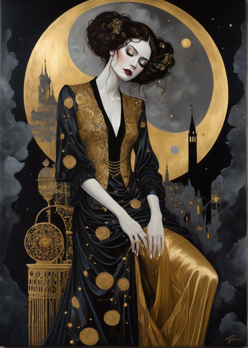 An elegant woman in a gold and black dress stands before a large moon with cloudy night skies and faint city outlines in the background.
