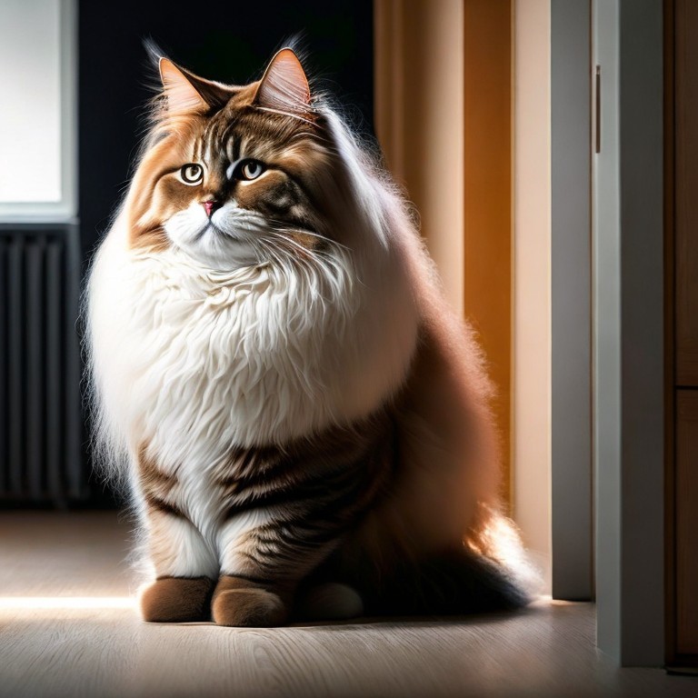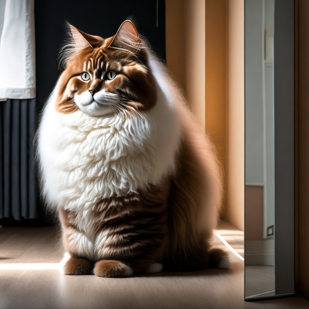 A fluffy Maine Coon cat sits majestically by a mirror, its luxurious fur highlighted by warm sunlight.