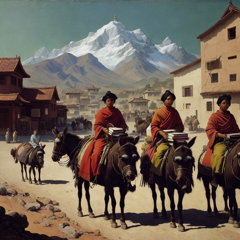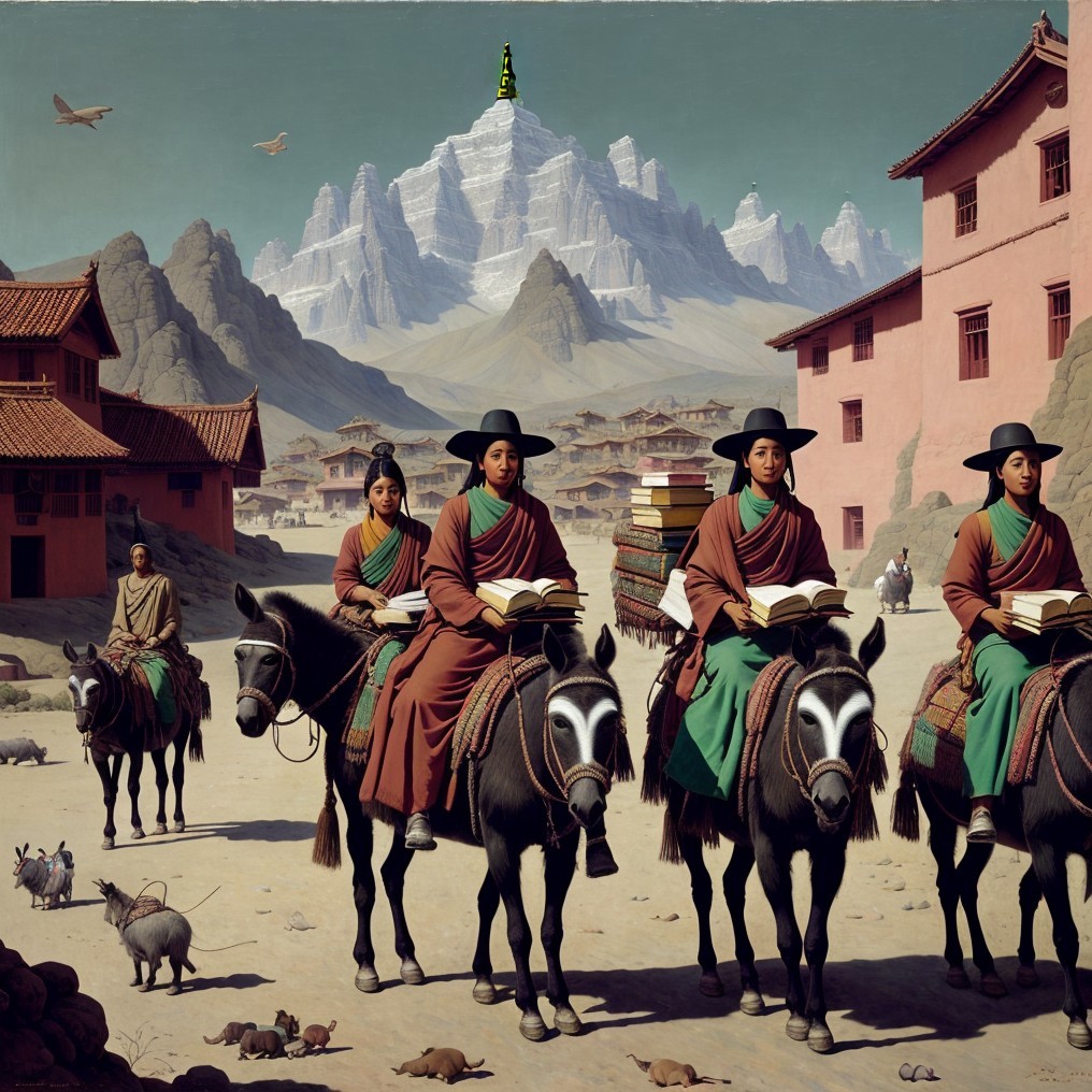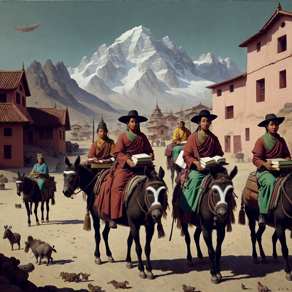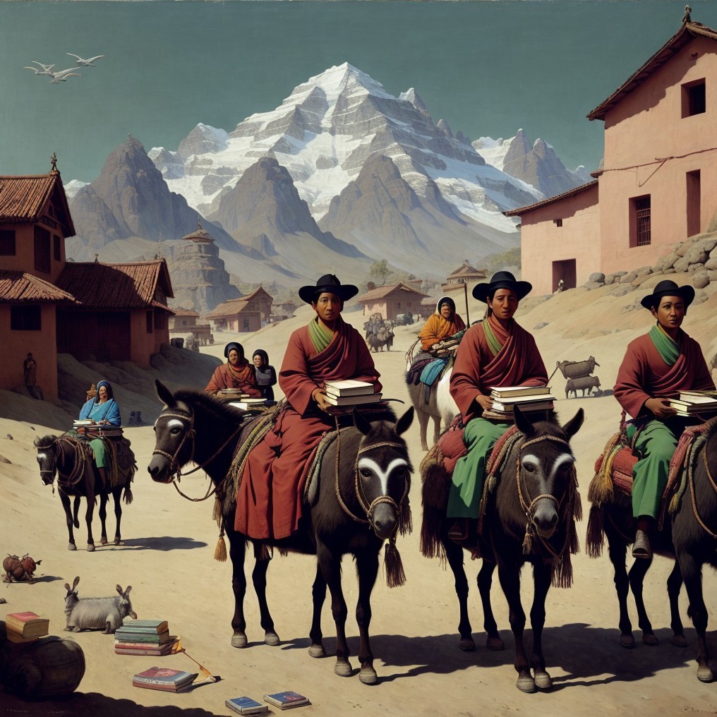 Three individuals wearing traditional garments riding donkeys in a serene mountainous landscape, with historical architecture and animals around.