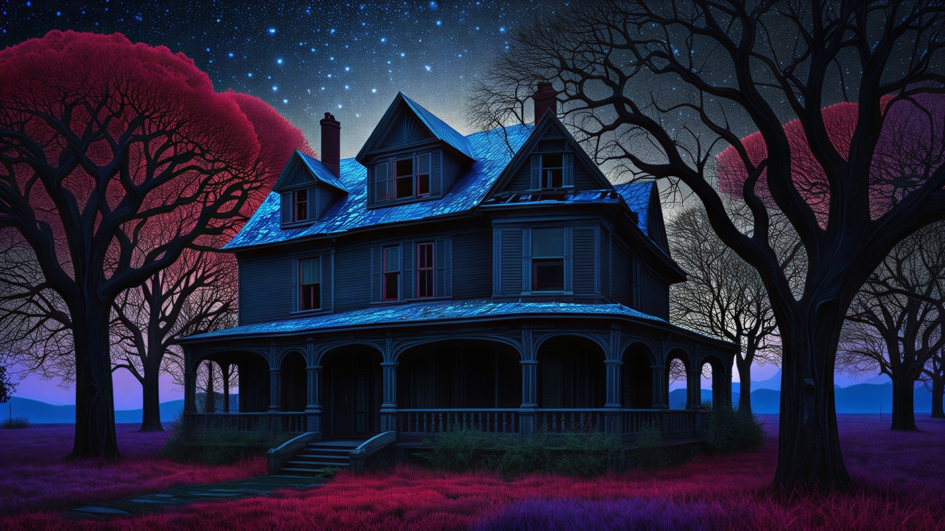 A digital art image shows an abandoned house on a starry night, surrounded by trees with either bare branches or leaves that glow red. The house itself is dark gray or black with a dark blue, shimmering roof, similar to a galaxy, and pinkish-red windows. The house has multiple dormer