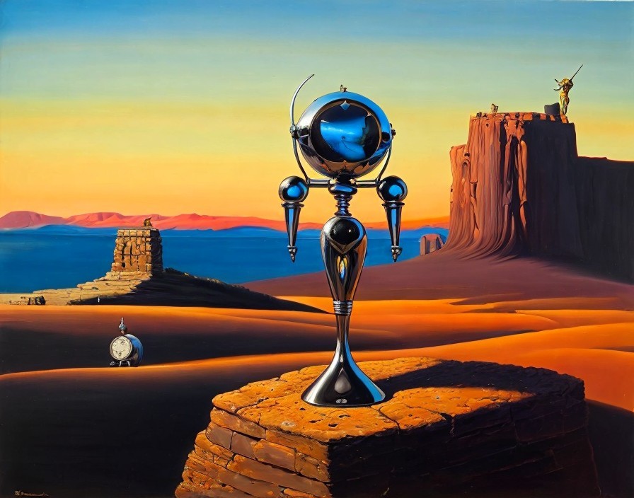 Surreal landscape featuring a melting clock-like figure, desert backdrop, and cliffs under a blue sky with distant figures.