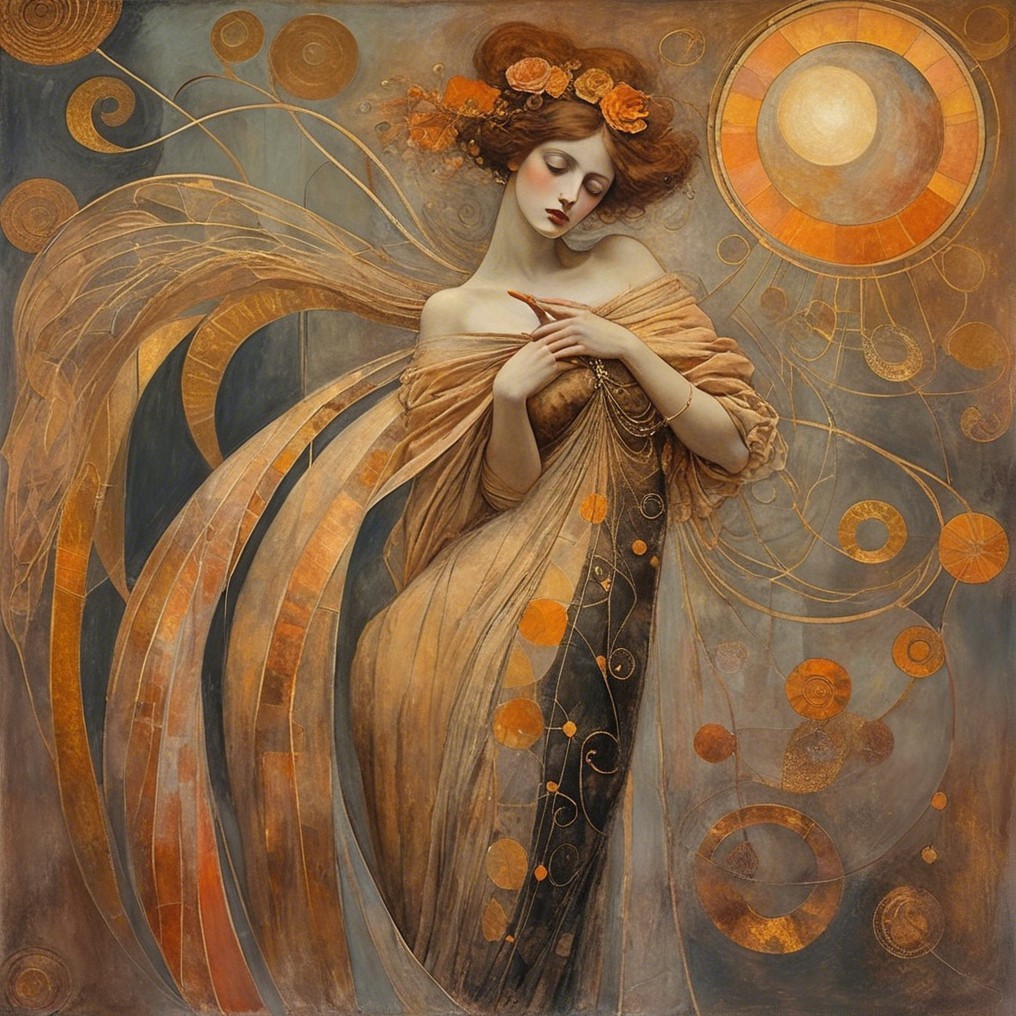 A captivating figure in flowing attire stands gracefully amidst swirls and circular patterns. Rich earthy tones and golden accents enhance the ethereal quality of the composition.