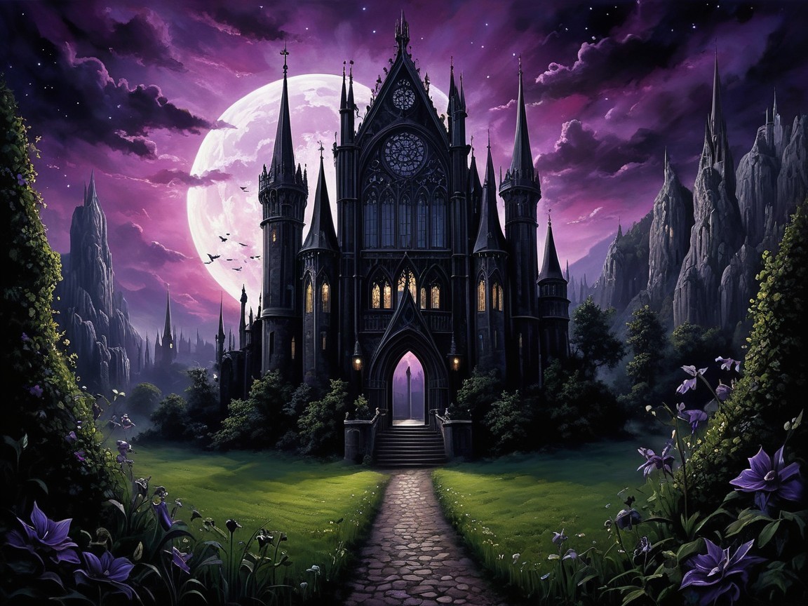 A majestic gothic castle stands against a vibrant purple sky, illuminated by a large moon. Surrounded by lush greenery and flowers, it exudes an enchanting, mysterious atmosphere.