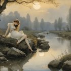 In a sunlit kitchen, two women prepare food. One, with flowing red hair, is slicing fruits, while the other watches. A serene landscape and soft light create a warm, inviting atmosphere.