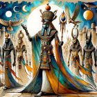 A woman in ornate attire plays a grand piano under a radiant sun. Surrounded by a serene, colorful backdrop, her focused expression reflects a blend of elegance and musical passion.