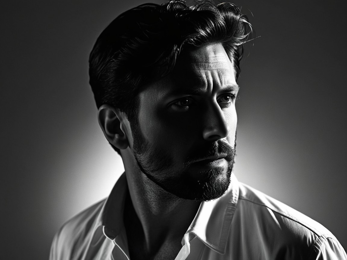 A dramatic black-and-white portrait of a man with tousled hair and a beard, gazing thoughtfully to the side. The lighting accentuates his strong features and intense expression.
