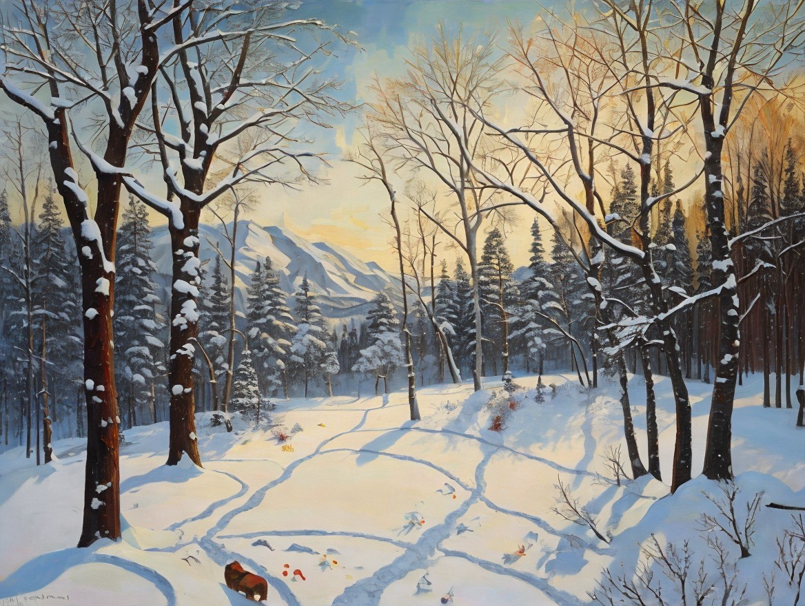 A serene winter landscape features snow-covered trees and distant mountains under a golden sky. A lone figure sits in the snowy foreground, immersed in the tranquil beauty of nature.