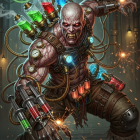 A muscular, menacing figure with pale skin and glowing red eyes stands in a dark, industrial setting. He's equipped with a complex harness of vials, tubes, and sparks, exuding an aura of danger and chaos.