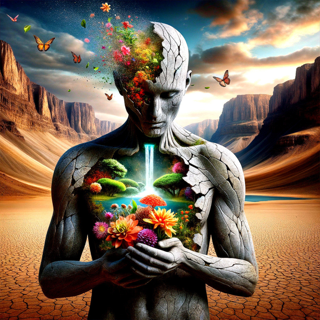 A surreal scene depicts a cracked, statue-like figure holding vibrant flowers and a waterfall, surrounded by butterflies, set against a dramatic desert landscape and mountains.