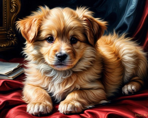 A young woman in a blue dress and wide-brimmed hat gazes thoughtfully from a balcony. The picturesque landscape features rolling hills and quaint buildings under a bright blue sky.