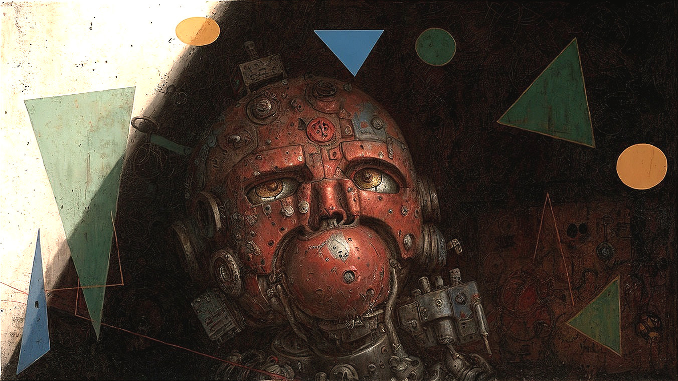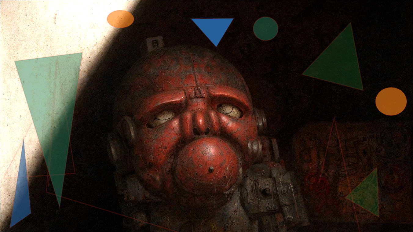 The image features a large, whimsical red robot head adorned with colorful details, standing in front of a textured wall decorated with geometric shapes and a smaller blue robot nearby.