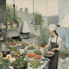 A bright, airy kitchen filled with fresh vegetables and herbs. A woman in a vintage outfit tends to a pot on the counter, surrounded by colorful produce and potted plants in a cozy atmosphere.