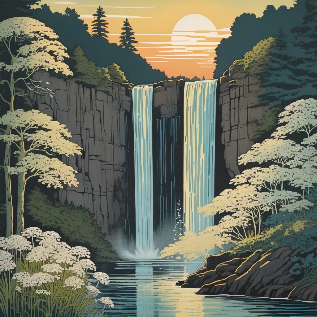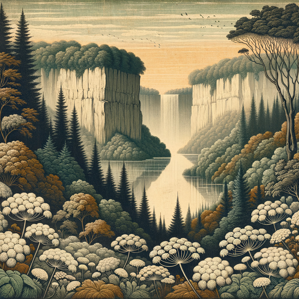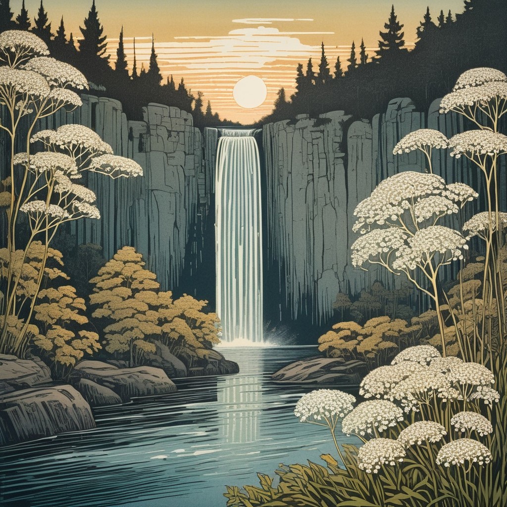 An illustrated scene of a tranquil forest at sunrise with Queen Annes Lace and vibrant trees in the foreground, and a large rising sun in the hazy sky.