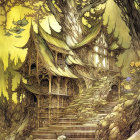 This artwork features two distinct houses on a hillside, surrounded by cypress trees. The sky swirls with vibrant yellows and blues, creating a dreamlike, expressive atmosphere reminiscent of Van Gogh.