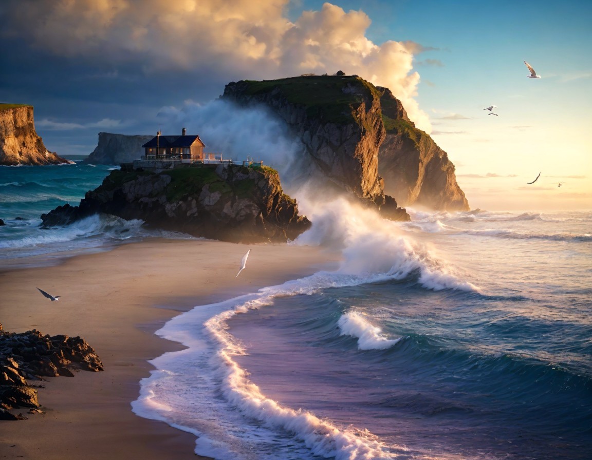 Prompt: "The sound of waves crashing against the shore provides a rhythmic soundtrack to the scene, enhancing the sensory experience. Seagulls may be seen gliding overhead, adding a touch of wildlife to the coastal ambiance. The combination of the soothing sound of the waves, the invigorating sea breeze, and the delightful fragrance of lavender creates a multisensory experience that is both calming and invigorating."