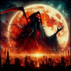 A cloaked warrior stands atop a skyscraper, wielding a fiery sword. With glowing red eyes and an ominous presence, the backdrop features a striking city skyline against a dramatic sky.
