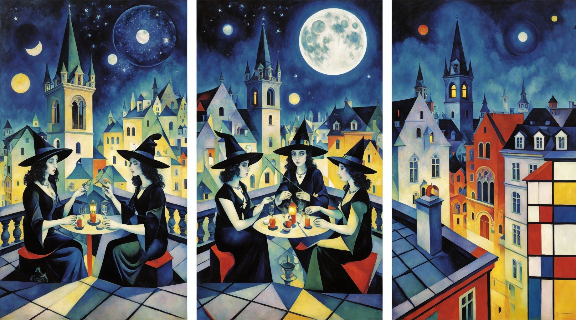 A triptych watercolor painting of women dressed as witches on a medieval rooftop at night, featuring a starry sky with a large, bright full moon, and various gothic spires surrounding the buildings. The left panel shows two witches seated at a small round table on a balcony overlooking the city, facing each