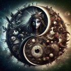 A mystical face emerges from an ornate, circular frame, featuring vibrant eyes and intricate designs. Colorful spheres surround her, set against a shimmering, golden background.