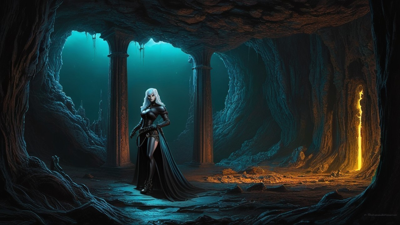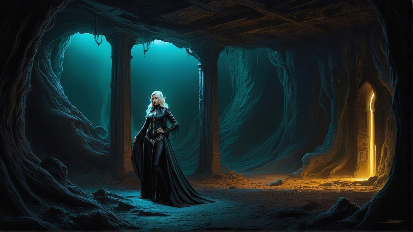Prompt: The worlds most neon crack den and it's quite eldritch too, an elven lady thief stalks through.