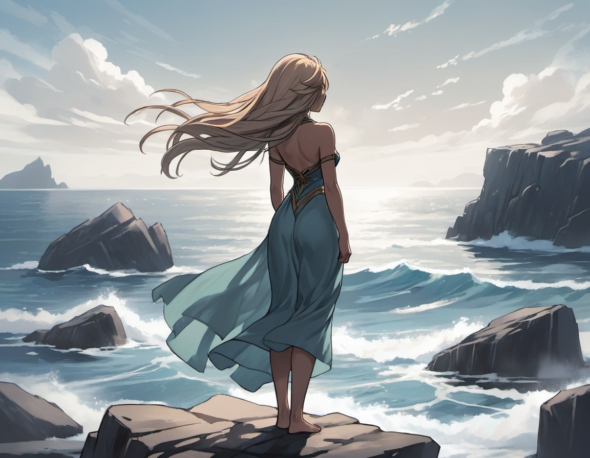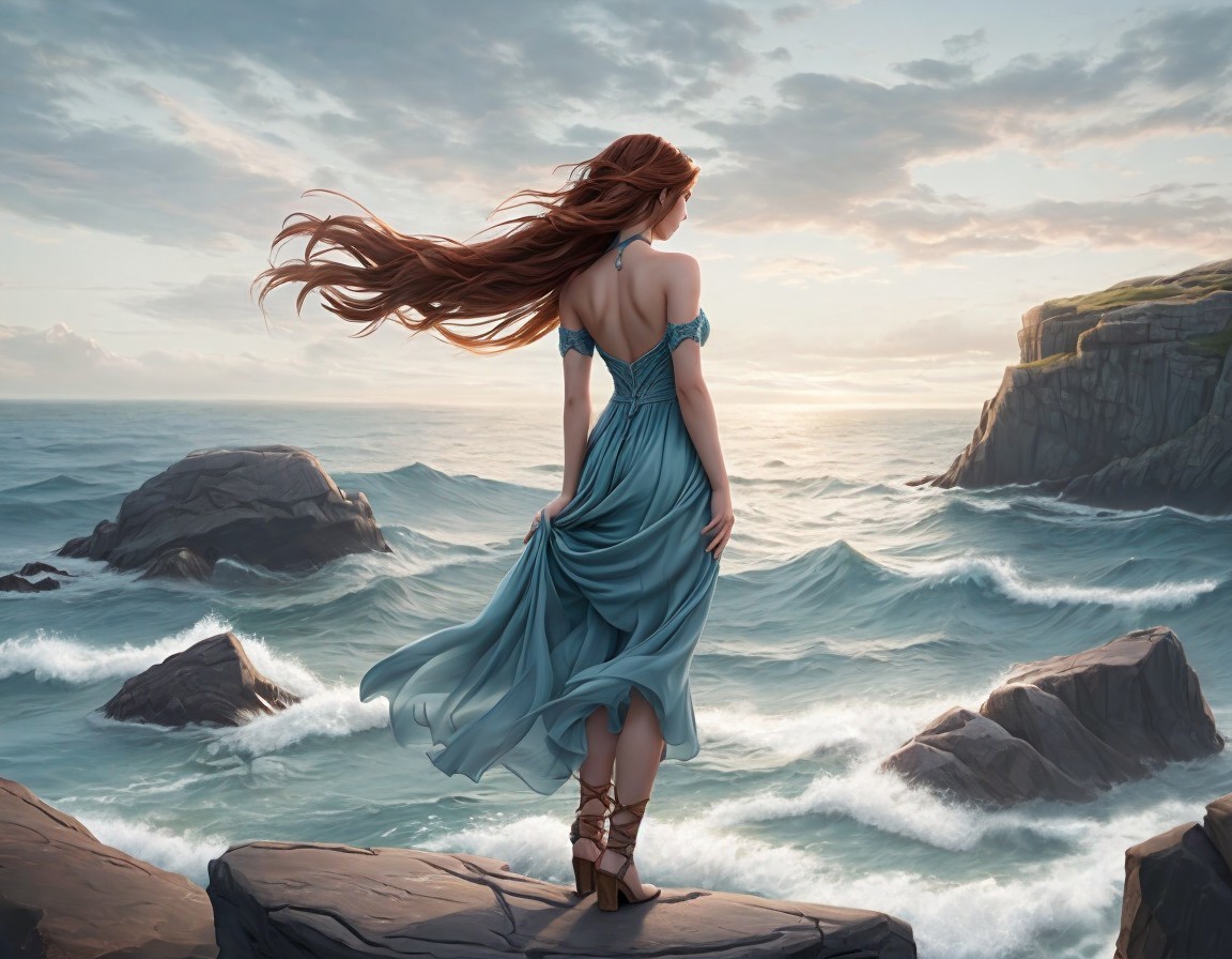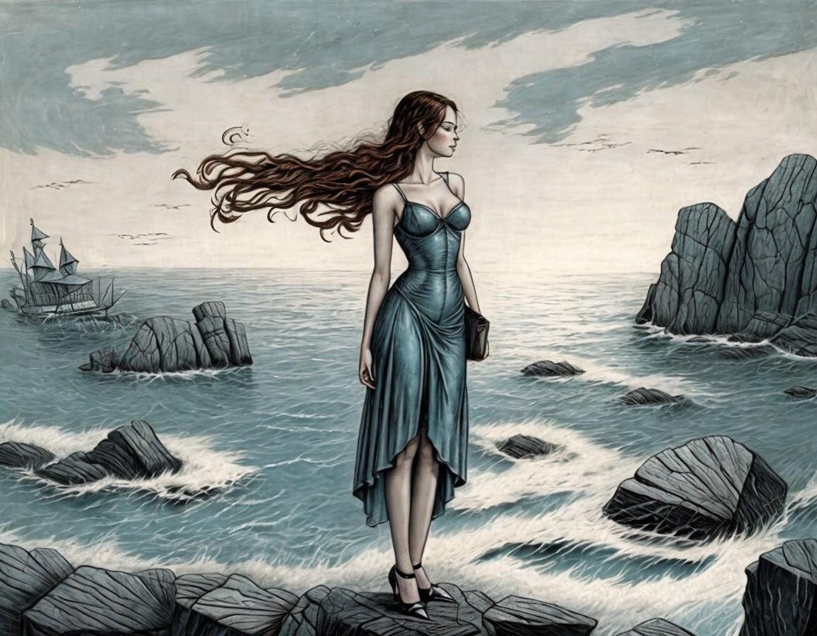 A painting of a woman with flowing hair in a blue dress standing on stones amidst water with a castle in the background.