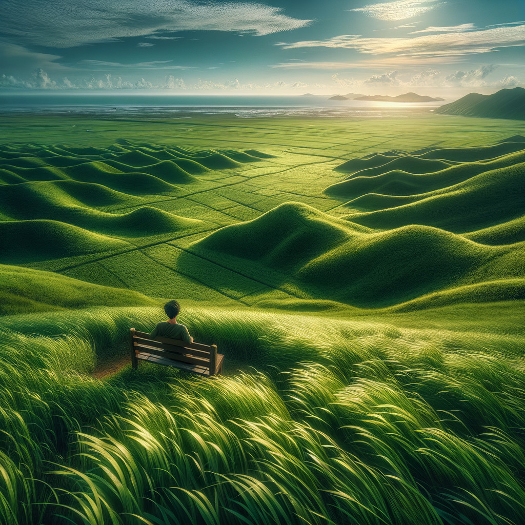 Rolling green hills with shadows, a lone tree in the foreground, and a sunlit landscape under a blue sky with clouds.