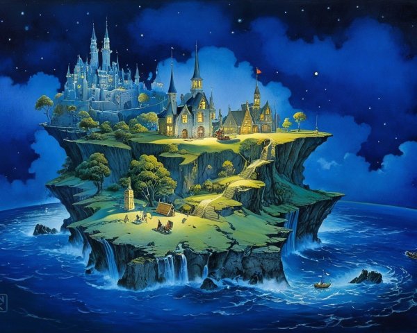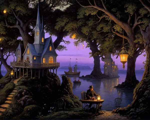 A serene scene depicts a boat with two figures, one wearing an orange hat, sailing toward a majestic castle on a distant island at sunset, with vibrant colors reflecting off the water.